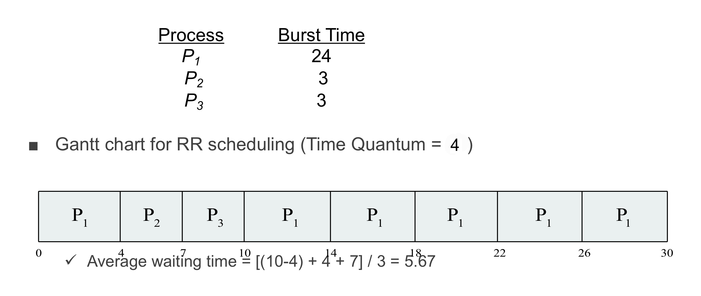 이 때, P2와 P3가 모두 종료되고 P1만 남는다 하더라도, time quantum은 여전히 4이기 때문에 P1은 4만큼씩만 실행이 가능합니다. 따라서 P1은 추가적으로 5번 더 스케줄링 되어 모든 프로세스가 종료됩니다.