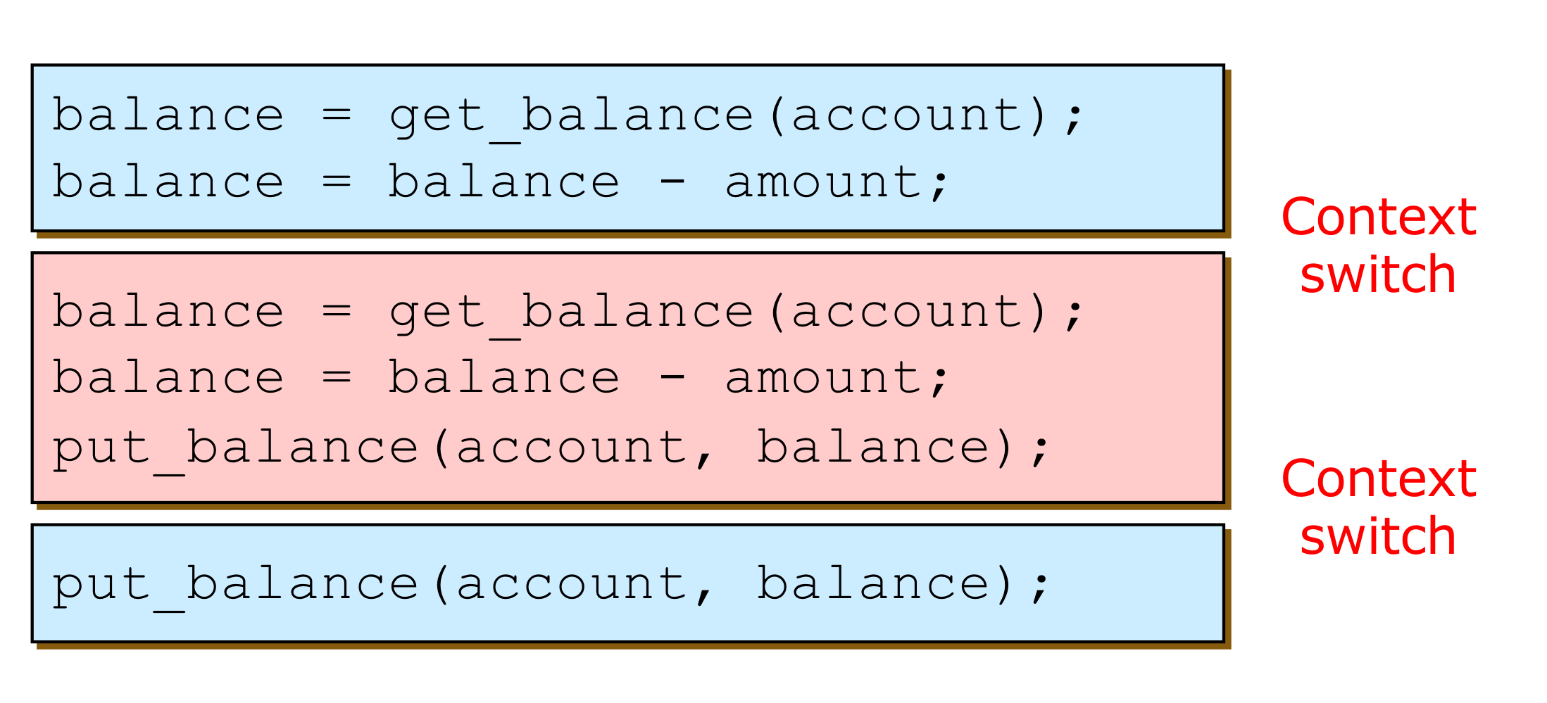 해당 코드는 문제가 없어보입니다. A와 B가 각각 10만원을 인출한다면 잔액은 80원이 될 것이라 예측됩니다. 하지만, 해당 코드에는 치명적인 오류가 있습니다. Multiprocess 환경에서는 언제든지 context switching이 일어날 수 있고, 그 시점에 따라 각각의 코드 섹션이 교차 배치 될 수 있기 때문입니다.