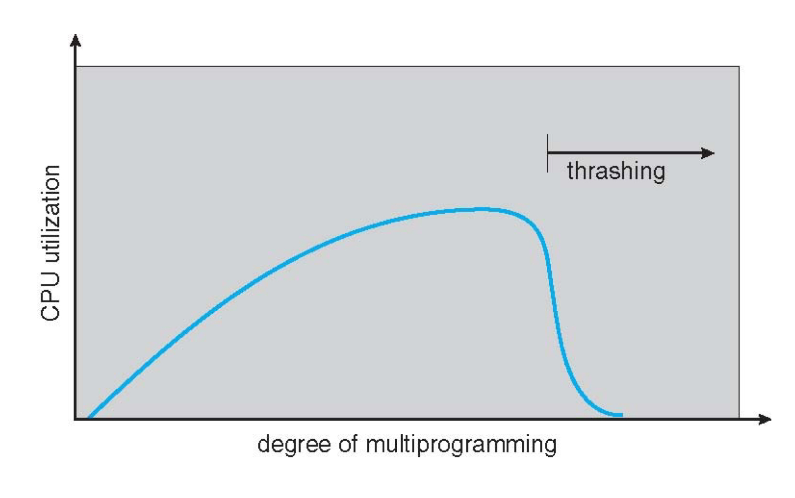 일반적으로, 프로세스의 개수가 증가하면 cpu utilization은 높아집니다. 그러나, 프로세스의 수가 과도하게 많아지면 특정 시간 동안 필요한 총 메모리의 크기가 physical memory 크기보다 커지게 됩니다. 결과적으로 Page fault와 replacement가 빈번하게 발생하여 cpu utilization이 떨어지는데, 이를 Thrashing이라고 합니다.