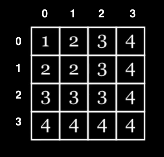 일단, 배열의 x, y 좌표와 배열 값 사이의 관계를 생각해보면, (x, y)의 값은 max(x, y) + 1 이 된다.