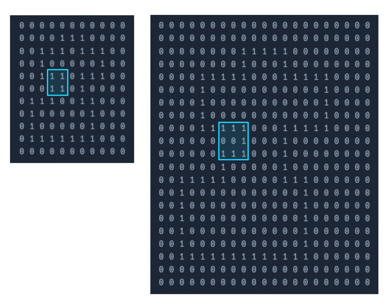 전체 직사각형의 영역을 먼저 표시한 후 사각형 내부만 다시 0으로 변경하면 된다.
