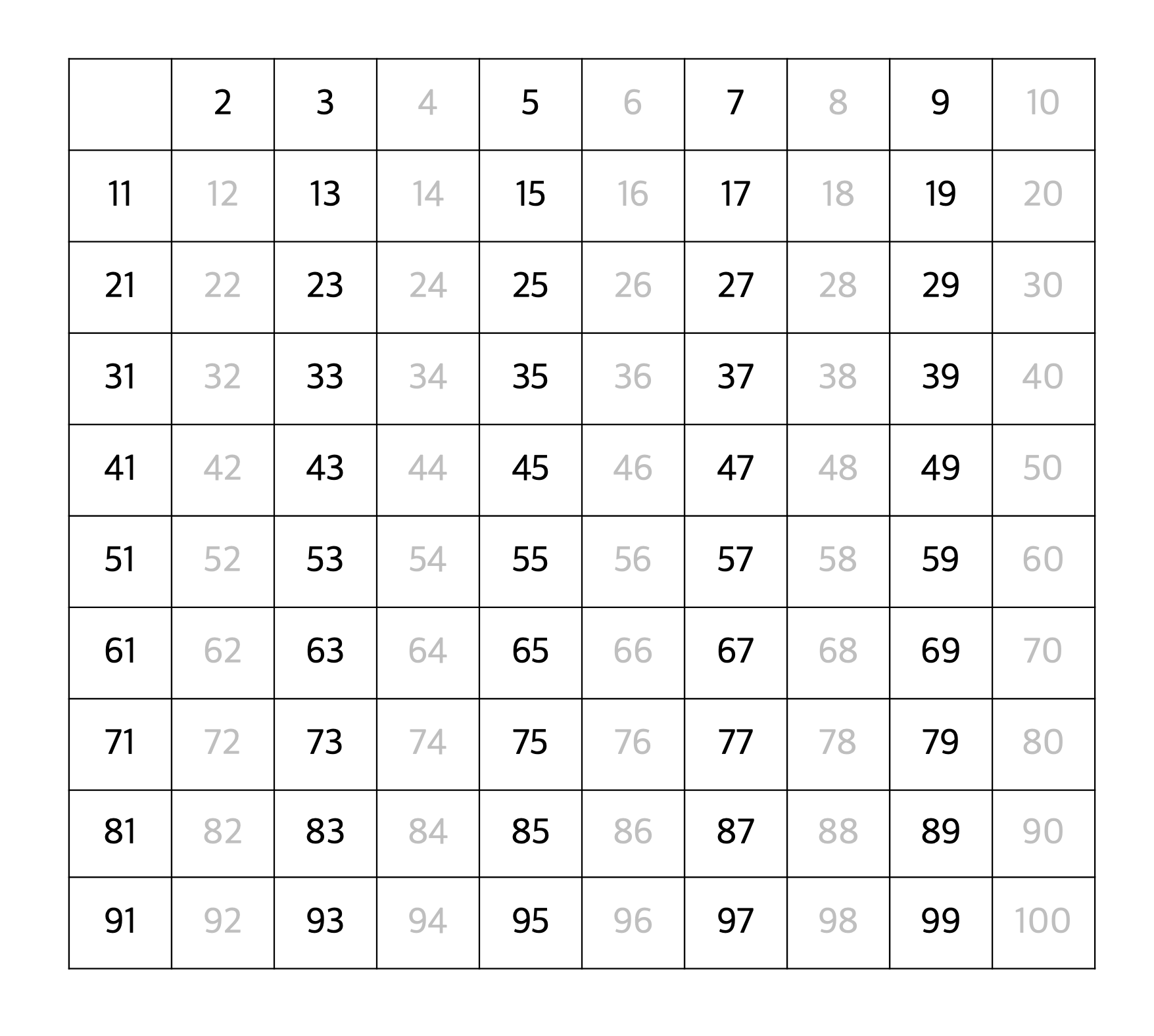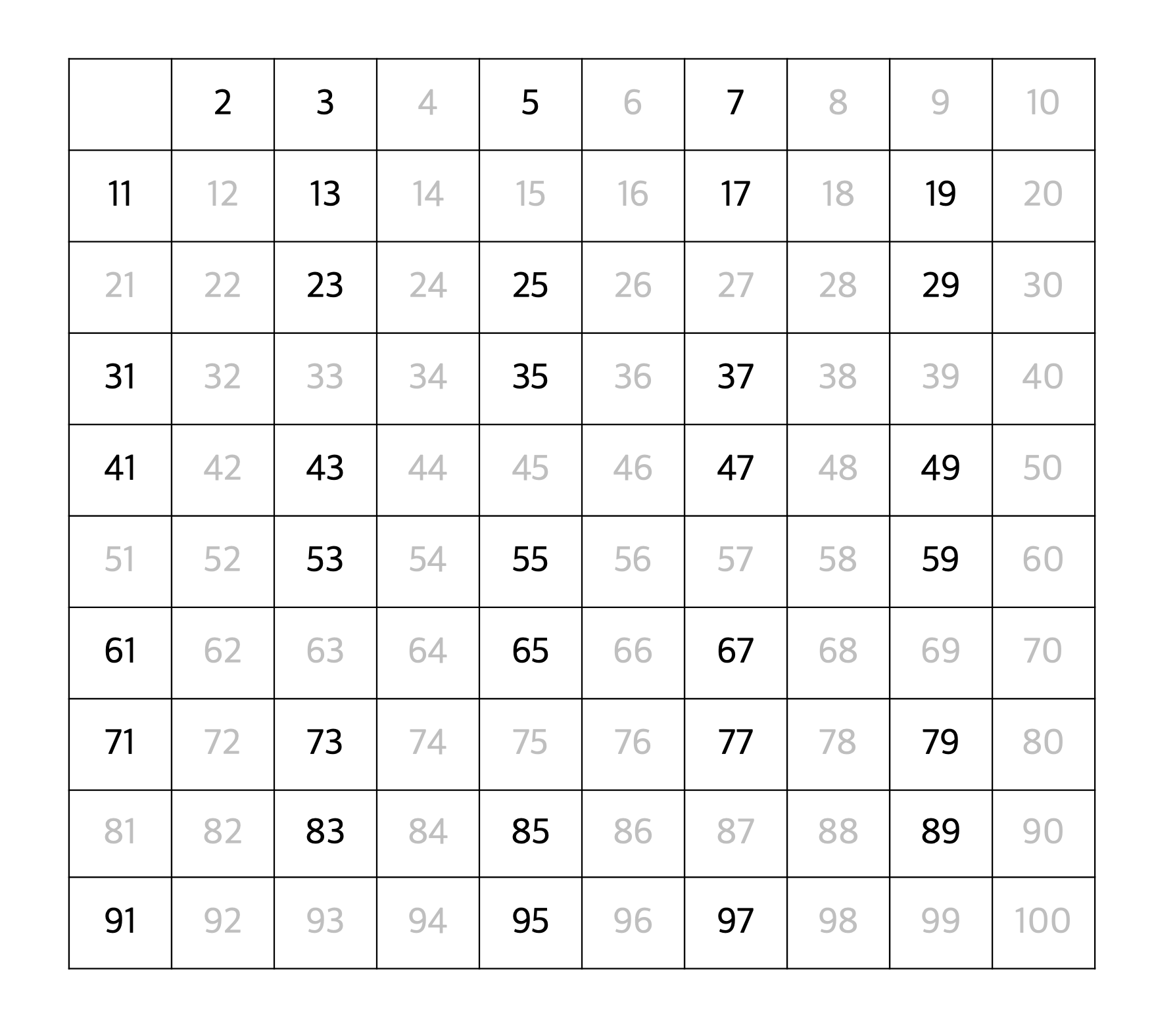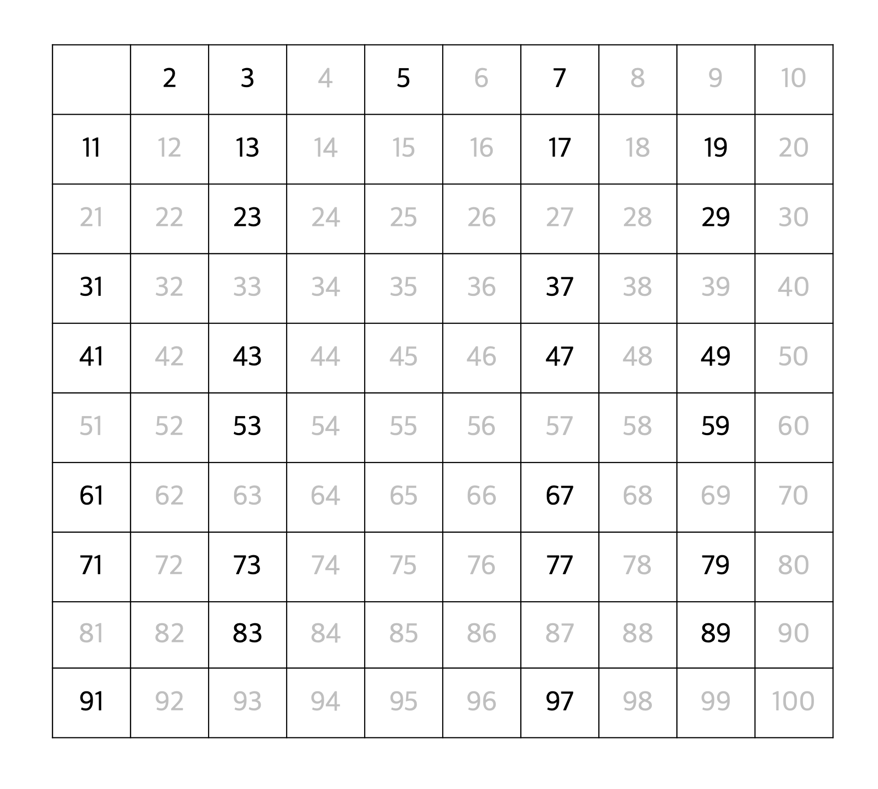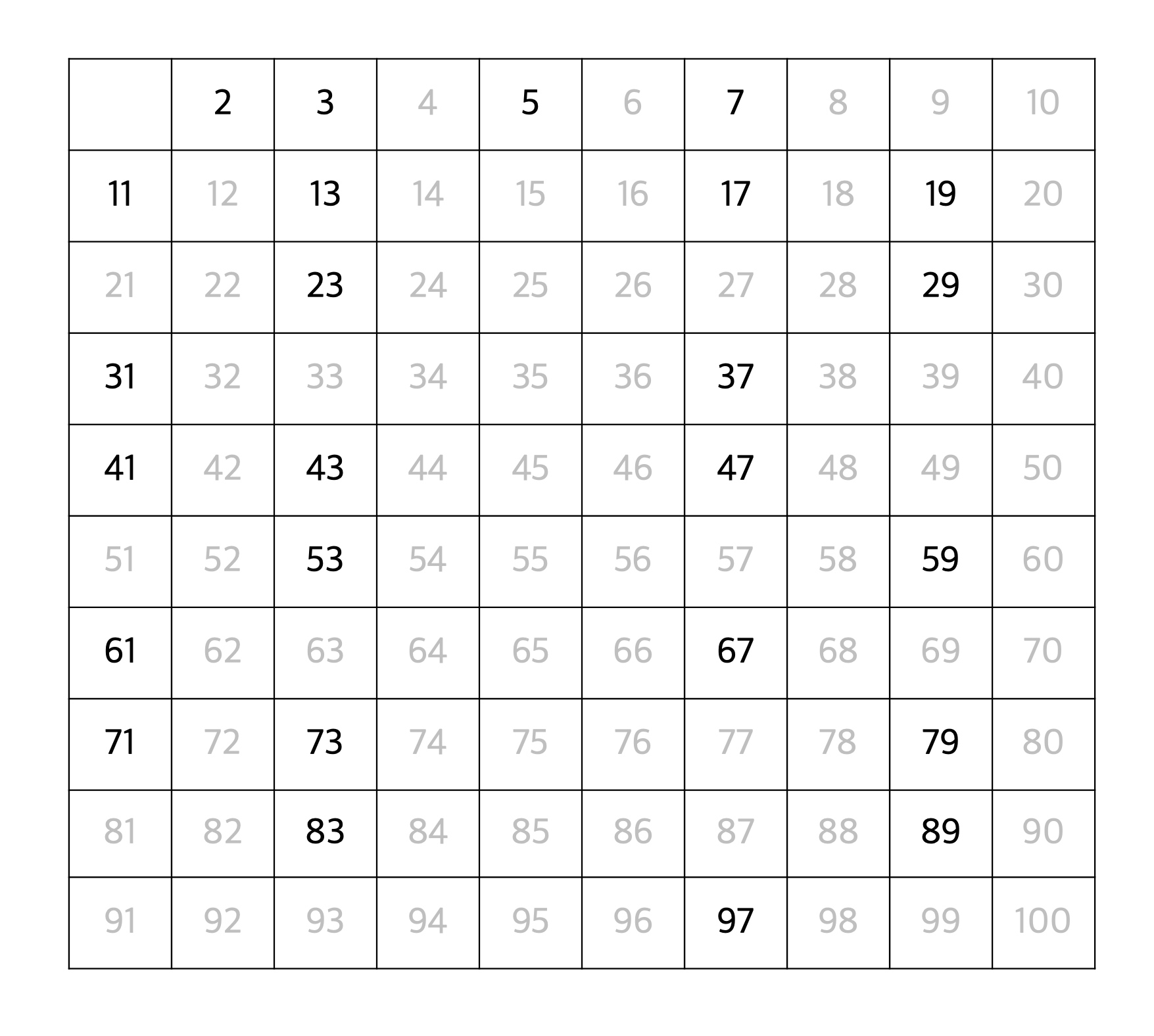 이를 반복하면, 최종적으로 100 이하의 소수 2, 3, 5, 7, 11, 13, 17, 19, 23, 29, 31, 37, 41, 43, 47, 53, 59, 61, 67, 71, 73, 79, 83, 89, 97 이 도출된다.