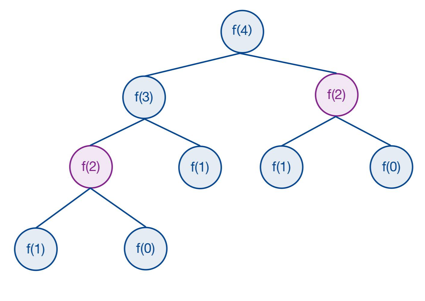 예를 들어, fibonacci(4)를 구한다고 생각해보자. f(2)는 항상 동일한 값을 가짐에도 불구하고 f(2)가 필요할 때마다(등장할 때마다) 새로 구해주어야 한다. 이와 같은 상황을 중복되는 하위 문제들(Overlapping Subproblems) 이라 표현하는데, 동적 계획법은 1) 최적 부분 구조를 갖고 2) 하위 문제들이 중복될 때 유용하게 사용할 수 있다.