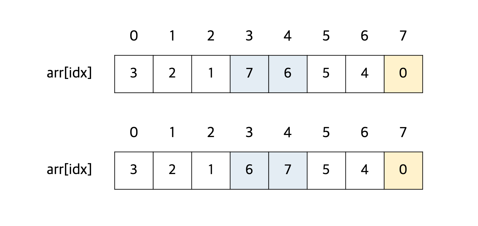 인덱스 3번에 있는 숫자 7은 인덱스 4번에 있는 숫자 6보다 크므로 두 수의 자리를 바꾼다.