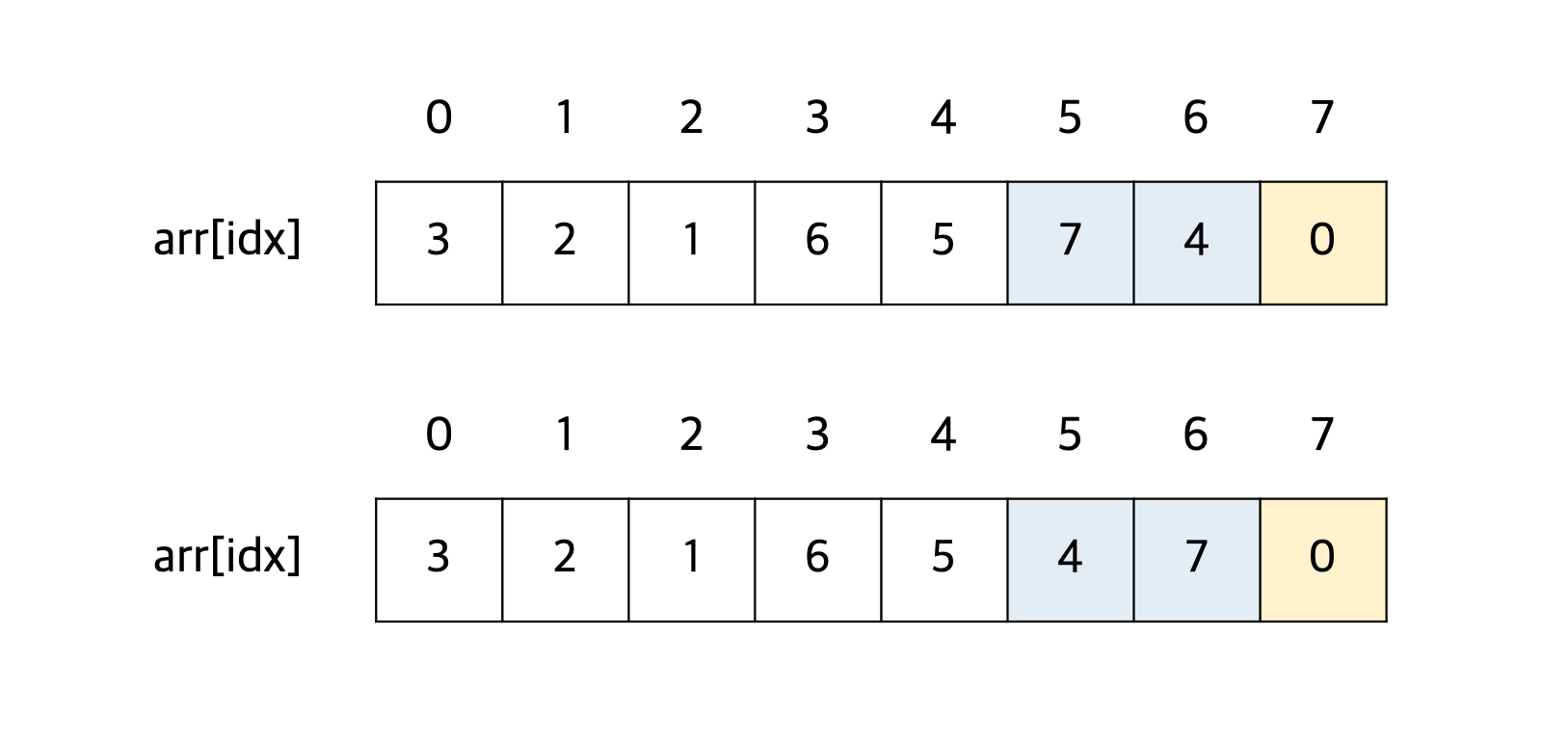인덱스 5번에 있는 숫자 7은 인덱스 6번에 있는 숫자 4보다 크므로 두 수의 자리를 바꾼다.