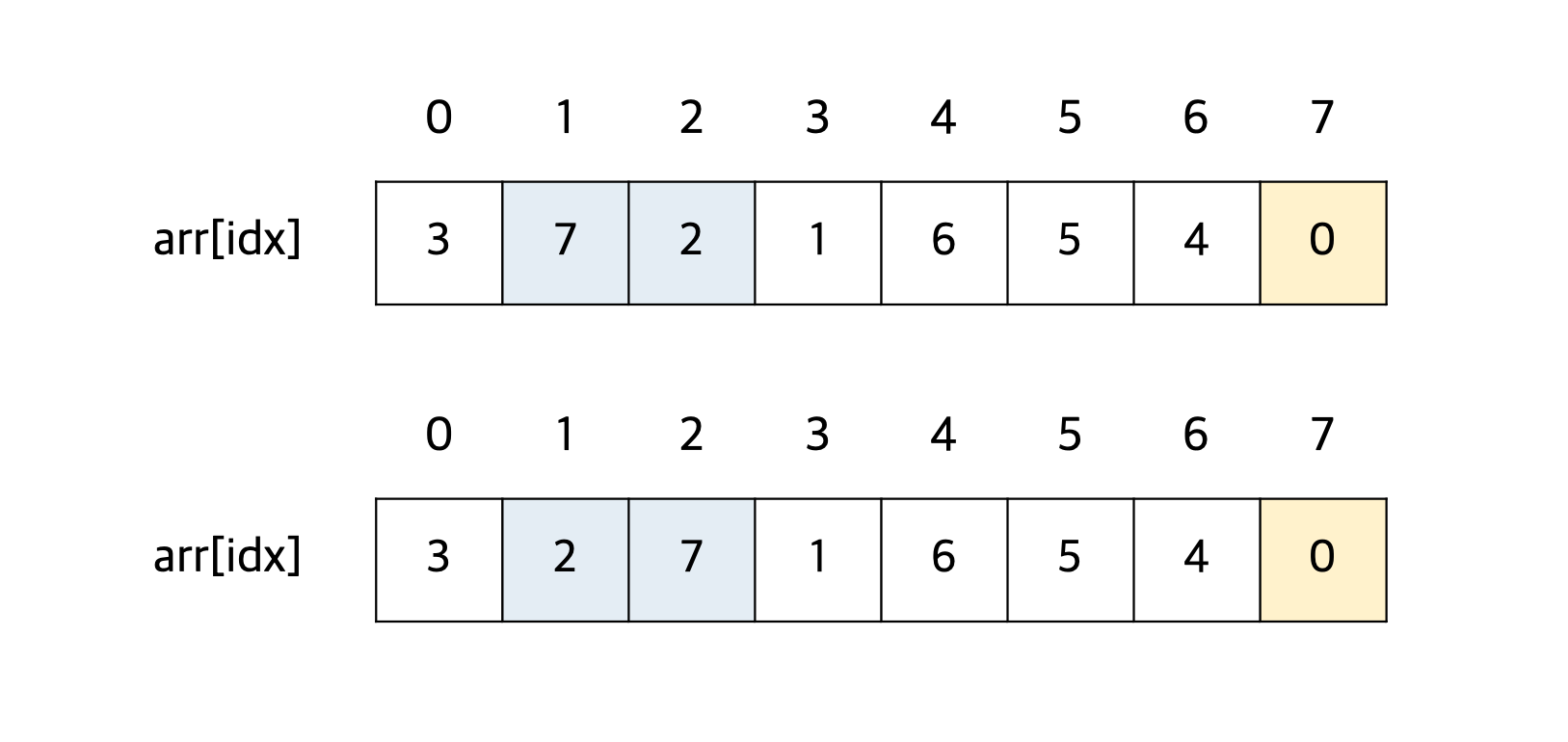 이어서, 인덱스 1번에 있는 숫자 7은 인덱스 2번에 있는 숫자 2보다 크므로 두수의 자리를 바꾼다.