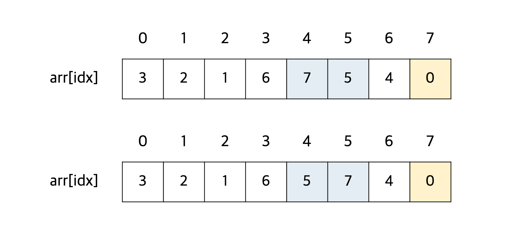 인덱스 4번에 있는 숫자 7은 인덱스 5번에 있는 숫자 5보다 크므로 두 수의 자리를 바꾼다.