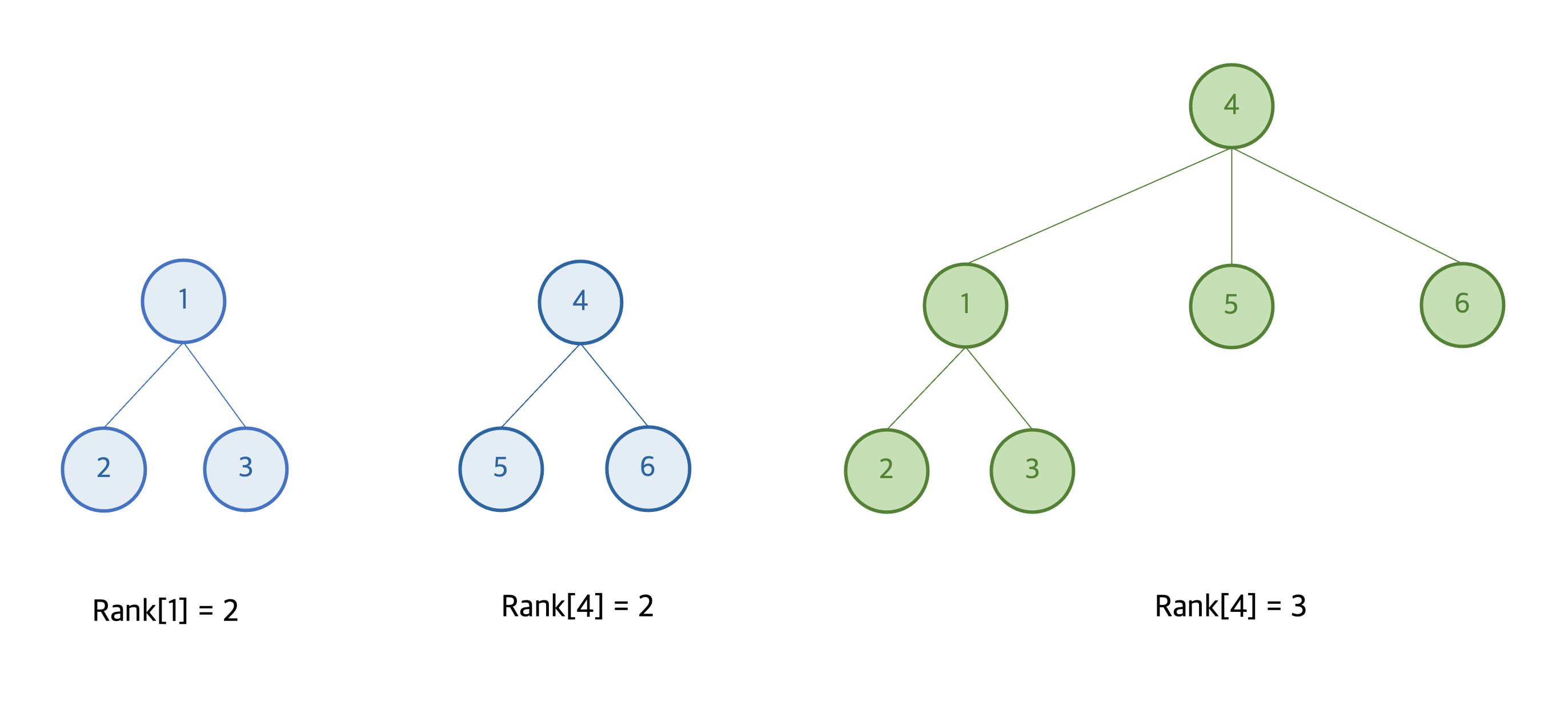이러한 상황을 막기 위해, 높이(rank)가 낮은 트리를 높이가 높은 트리의 밑에 넣는 union-by-rank 방법을 사용할 수 있다. 높이가 낮은 트리를 높이가 높은 트리의 밑에 넣으면, 두 트리의 높이가 다를 경우 합친 트리의 높이는 변함이 없고, 합치고자 하는 두 트리의 높이가 같을 경우에만 합친 트리의 높이가 1 증가한다. 결국, 트리의 높이는 노드 개수의 log에 비례하게 되고,시간복잡도 O(logN) 내에 Union-Find 알고리즘을 수행할 수 있게 된다.