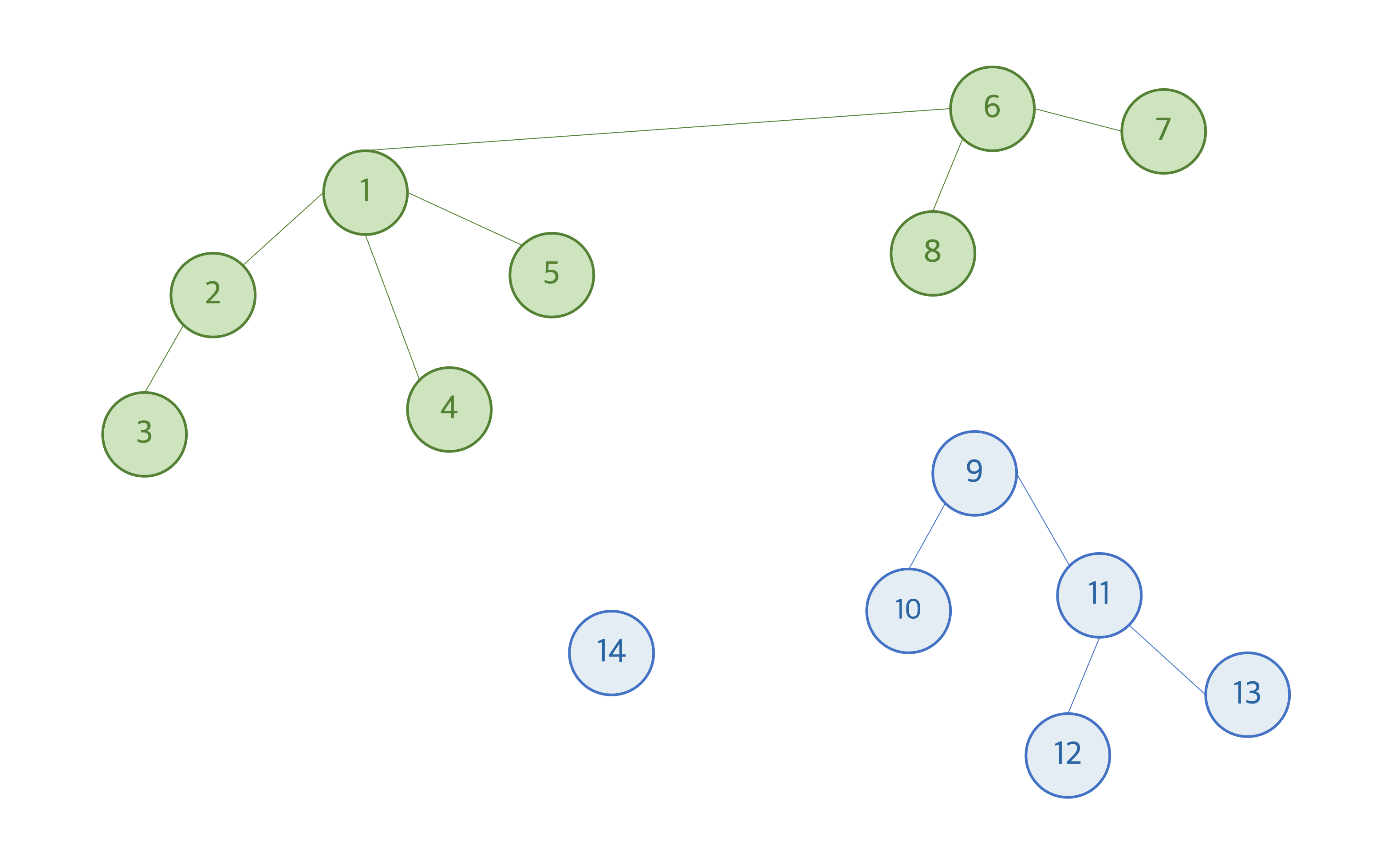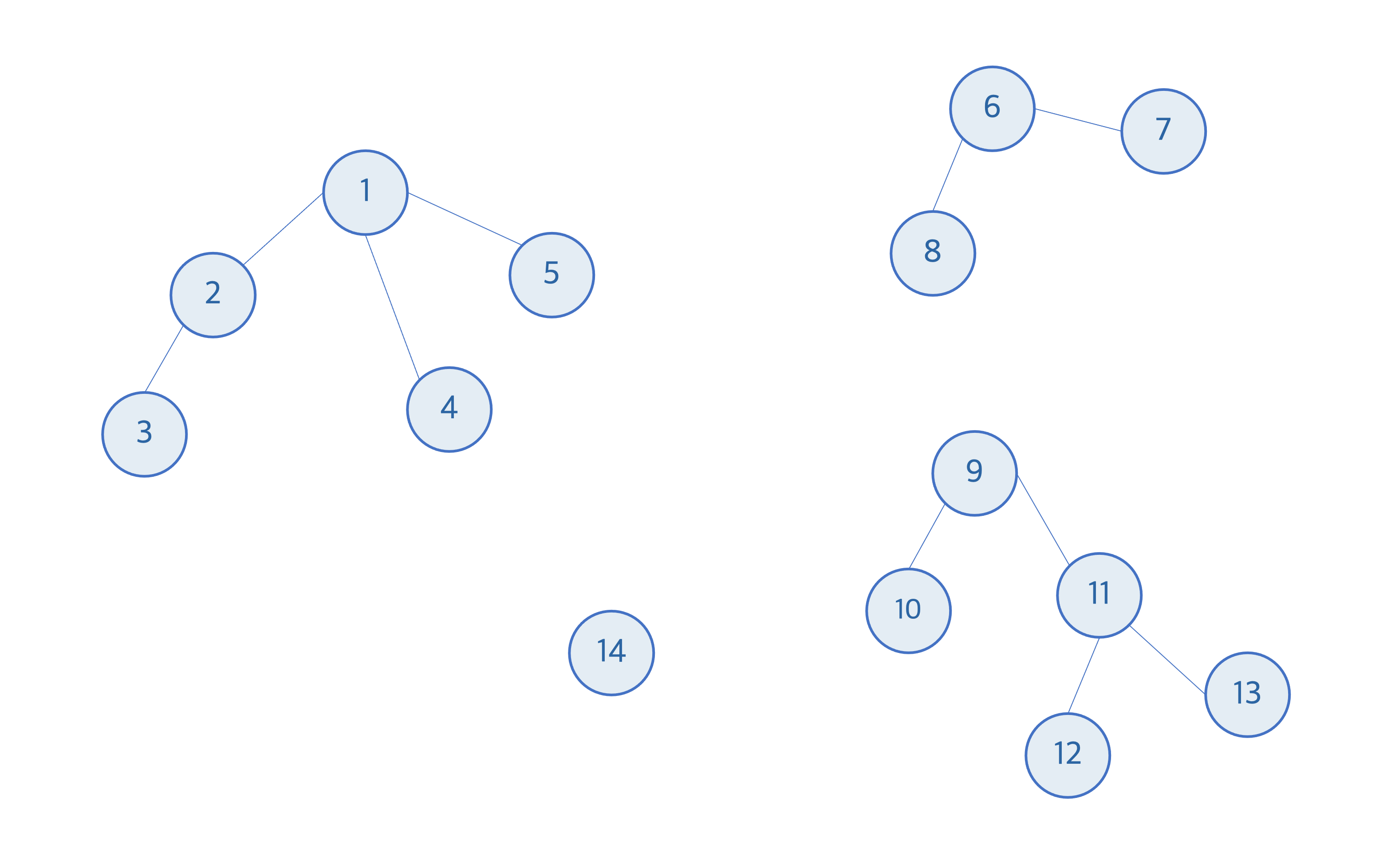 위의 그림에서 원소들의 상호 배타적 집합은 총 4개이다. 각 원소들은 하나의 집합에 포함되어있고, 같은 집합에 포함되어있는 원소들은 같은 루트 노드를 공유한다. 예를 들어, 노드 2번과 노드 4번은 같은 집합에 포함되어 하나의 트리로 연결되어있고 루트 노드 1번을 공유한다. 노드 6번과 노드 11번은 각각 다른 집합에 포함되어있고 다른 루트노드를 가진다. 노드 14번은 자체의 집합이면서, 자체의 루트 노드를 가진다.