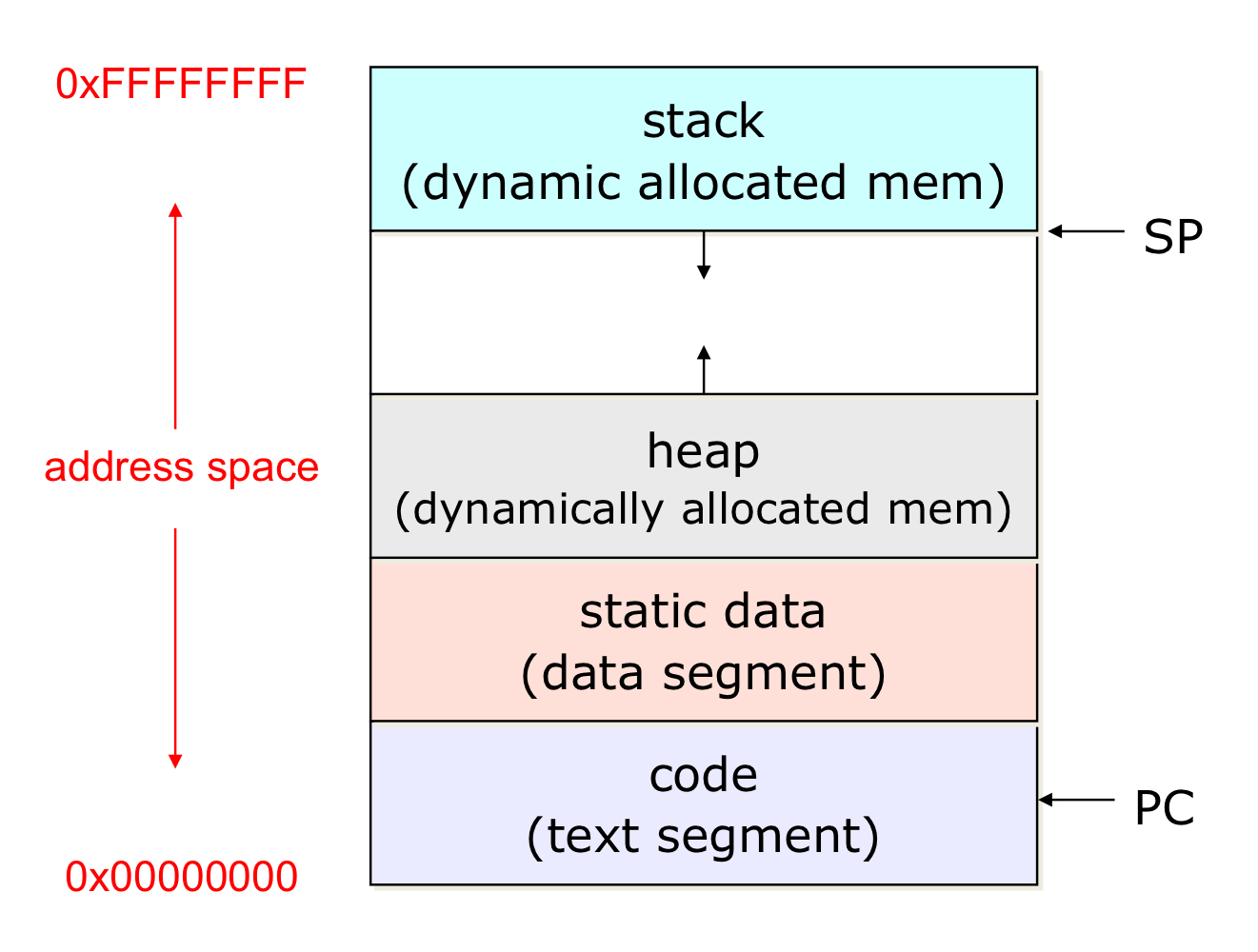 프로그램을 실행하게 되면, 디스크에 있는 바이너리코드가 code segment 단에 적재됩니다. 프로그램을 이루는 코드가 1줄씩 실행될 때마다 PC(Program Count)가 1씩 증가합니다.